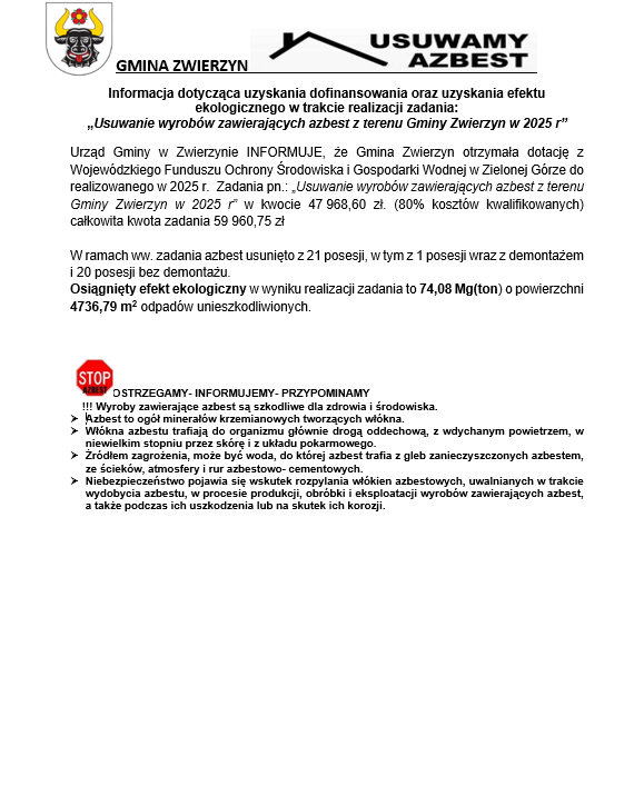 Informacja dotycząca uzyskania dofinansowania oraz uzyskania efektu ekologicznego w trakcie realizacji zadania: „Usuwanie wyrobów zawierających azbest z terenu Gminy Zwierzyn w 2025 r”